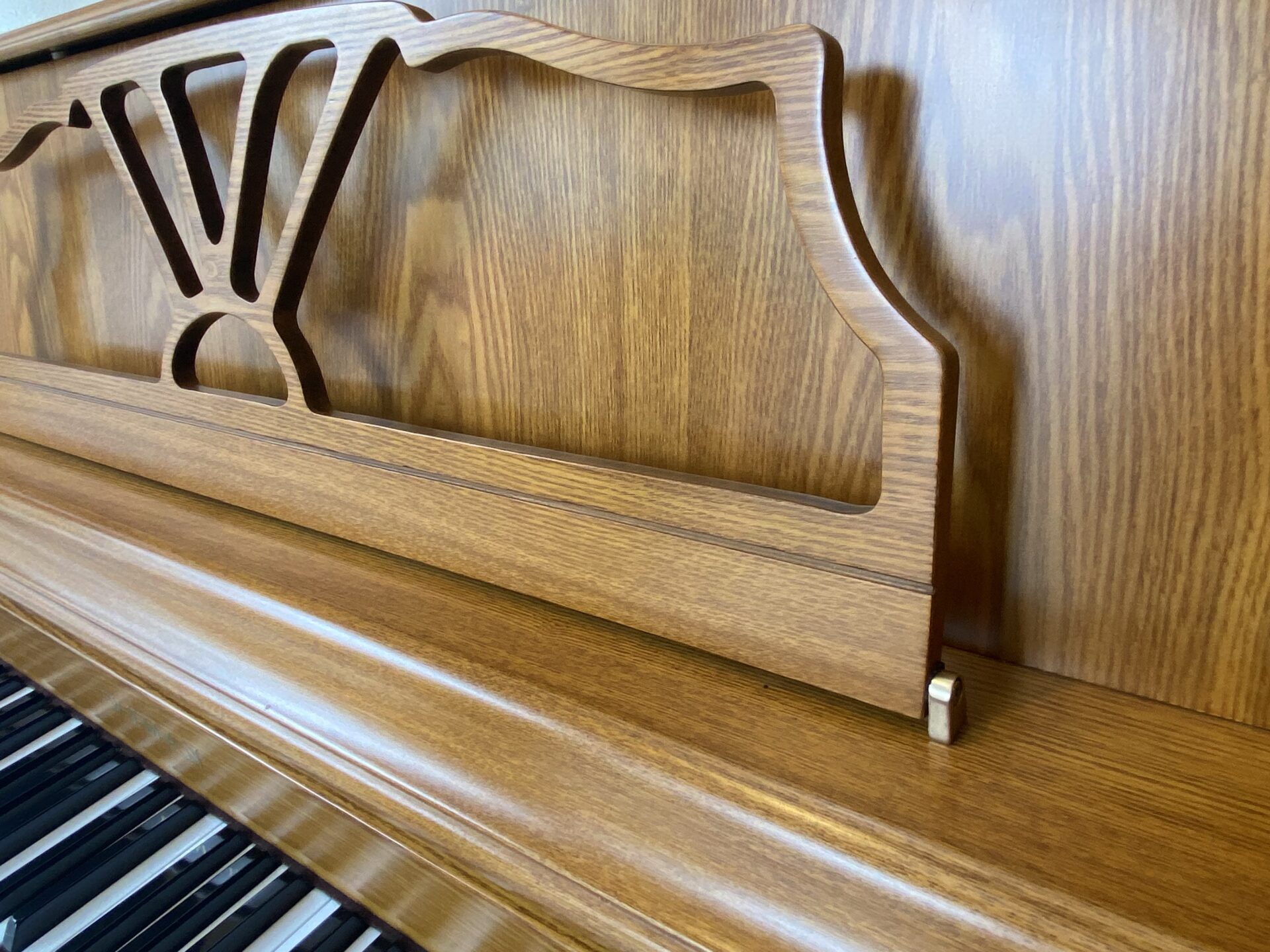 スライド式鍵盤蓋もユニークです。オークの色彩はフローリングの床のお部屋などにはインテリアとしても素敵です。