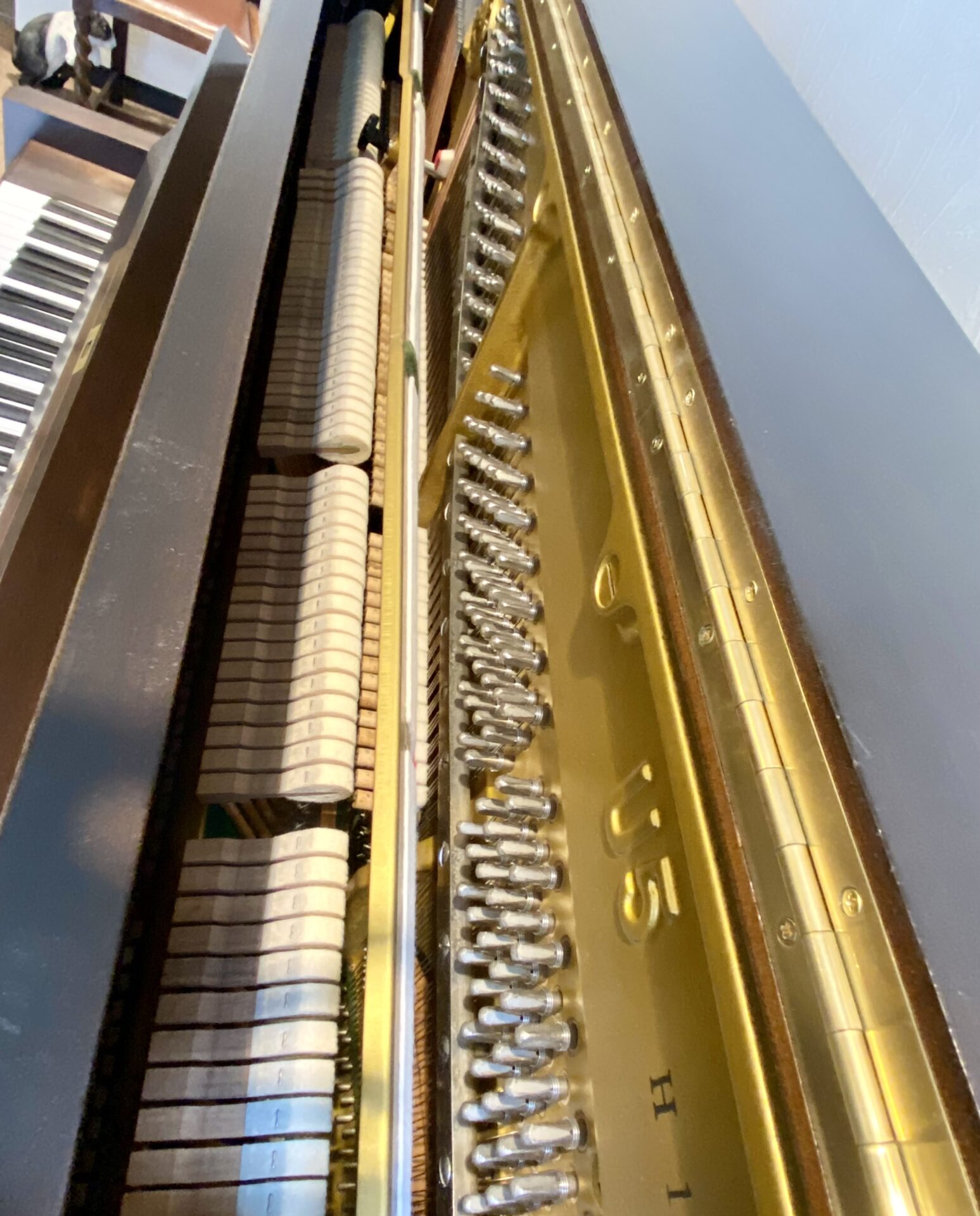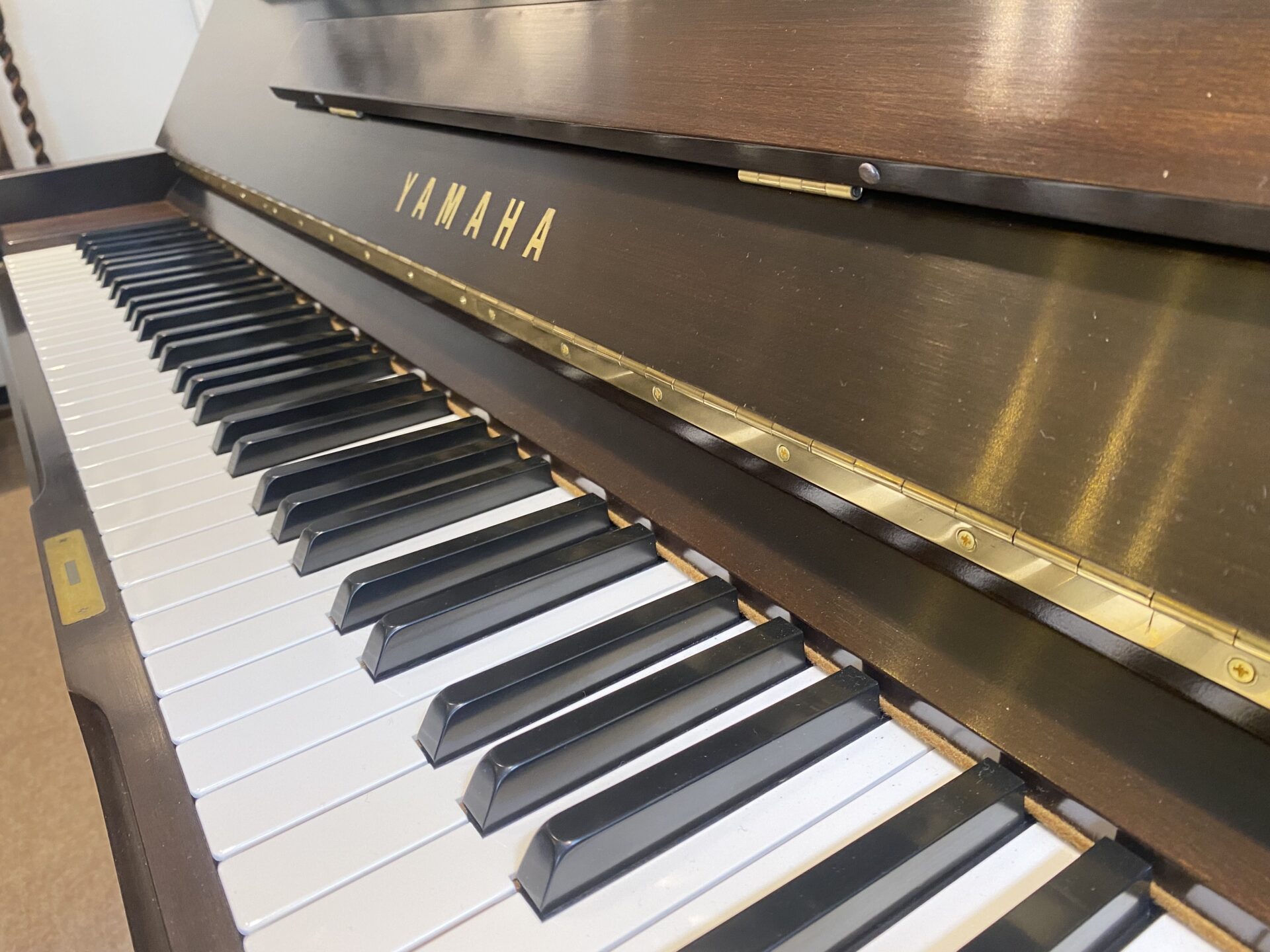 重厚感の塊のようなこのピアノ、当時のアップライト最高機種でヤマハの技術の粋が集まった感じです。木目は渋めのダークウォルナットの艶消しで、余計に重厚感を引き立たせます。外装もかなり綺麗ですが、内部も入念に修理調整されていますので、これからまだまだ末永くお使いいただけます。このモデルは新品価格が高価だったためか流通量が極めて少なく、かつここまで状態の良い個体が入荷することは滅多にございません。