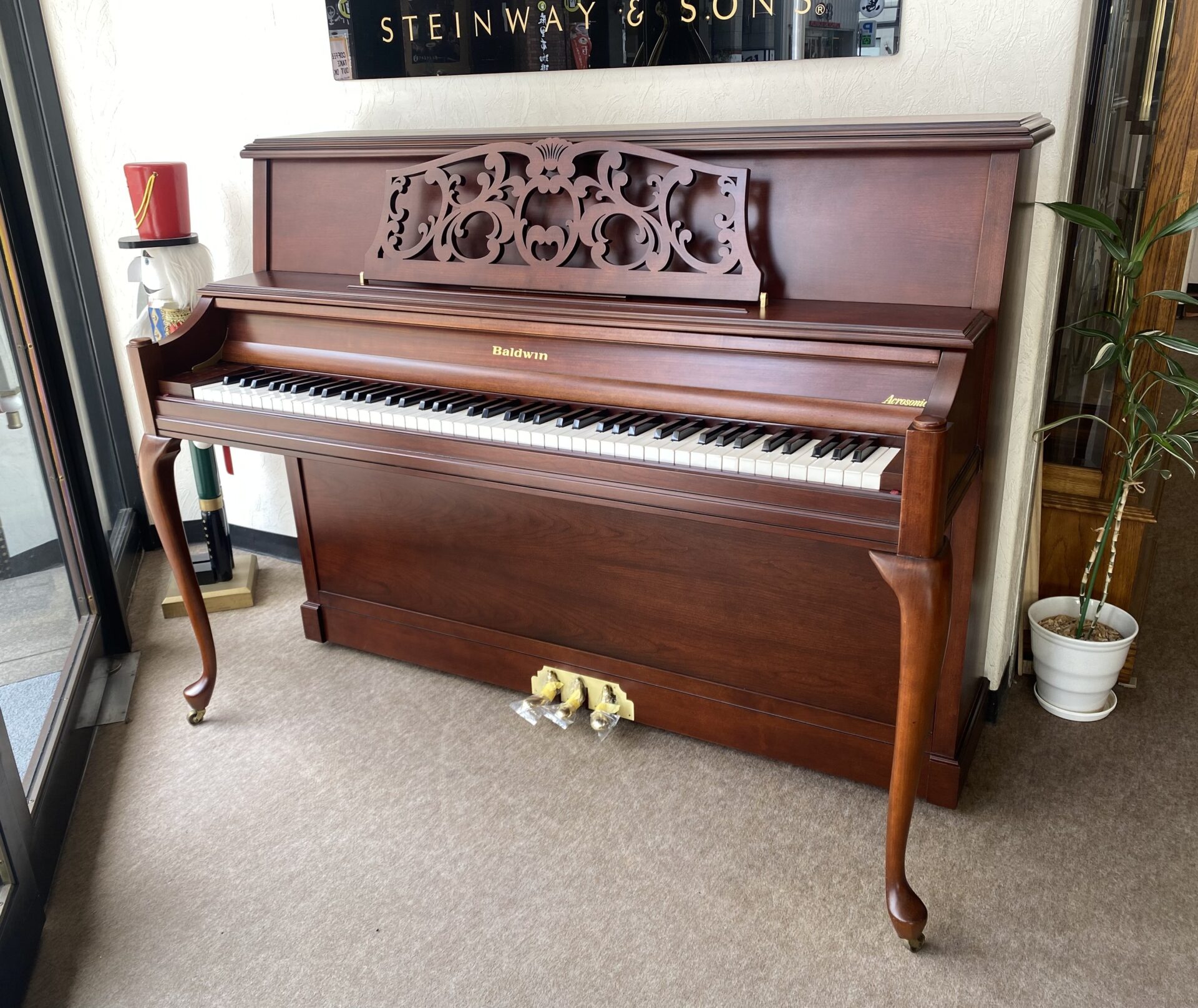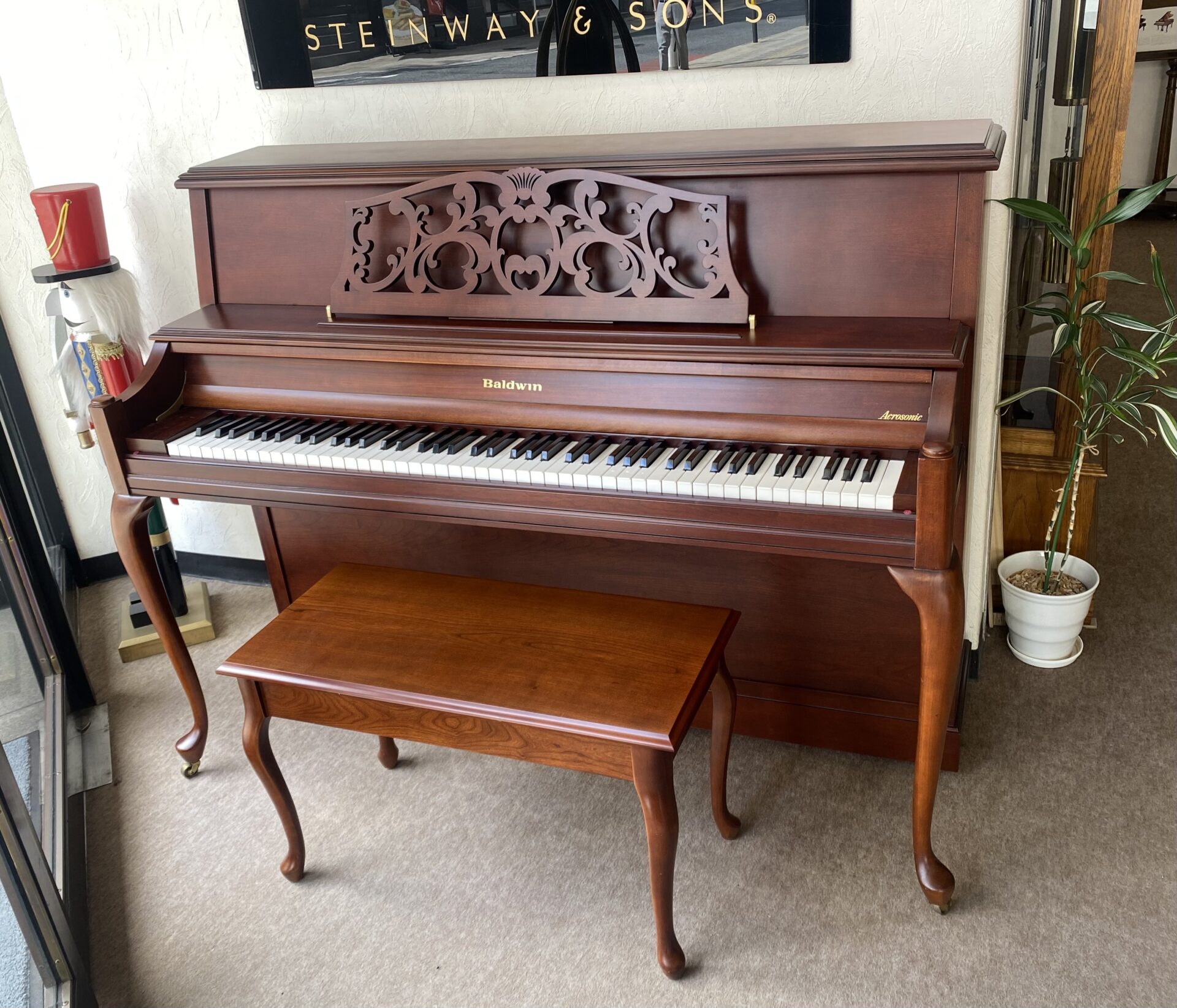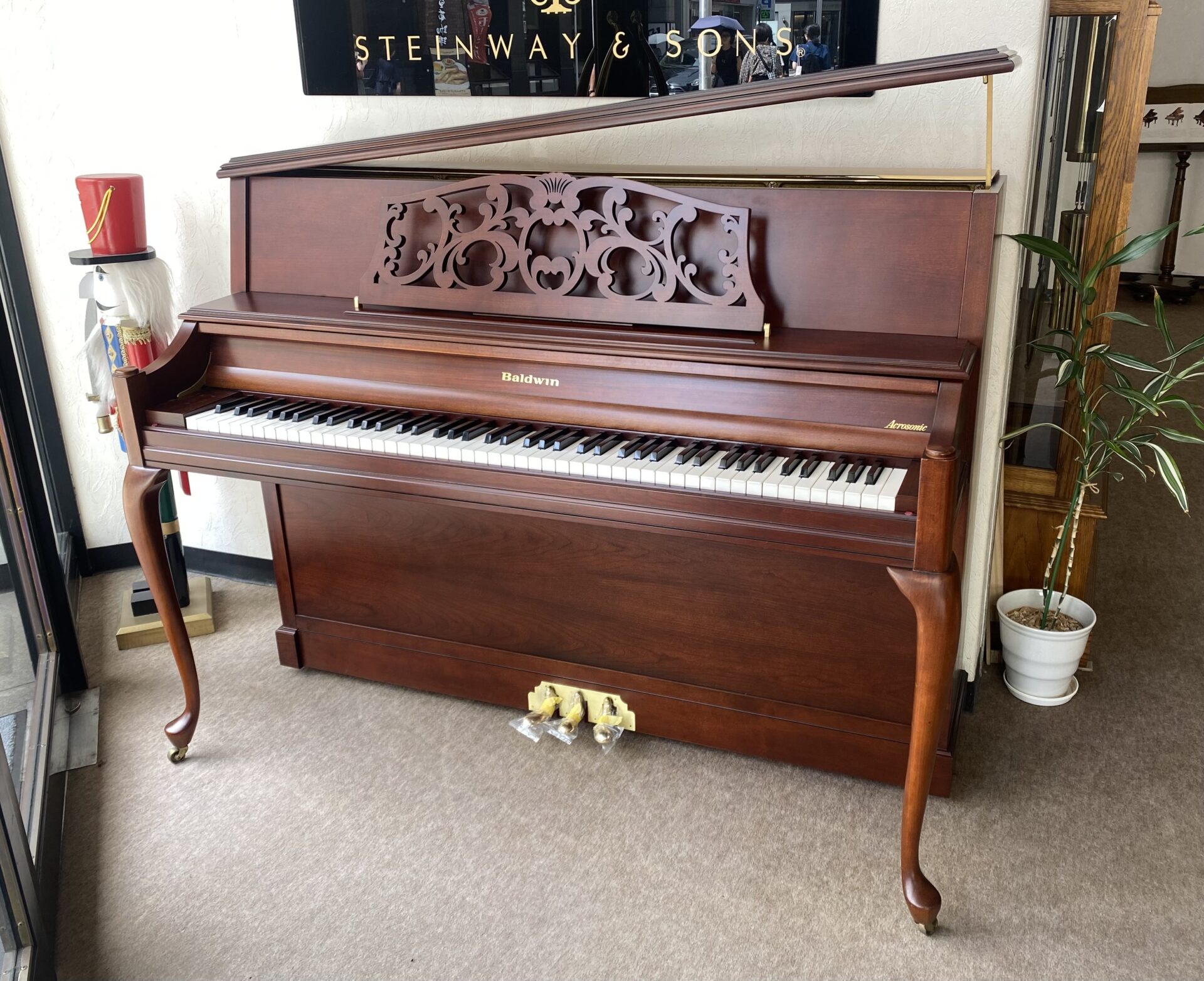 高さ112cmと、コンパクトに感じますがアメリカ製ピアノとしては標準サイズです。 アメリカで当時最大のメーカーだったBaldwin(ボールドウィン)は、フルコンサートグランドピアノまでラインナップしていて、多くのアーティストから支持されていましたが、日本人では小澤征爾さんが有名です。 今回入荷のこのモデル、新品時に弊社で輸入、販売させていただいたもので、元々耐久性で定評あるアメリカ製ですが、今回また全塗装、再調整して新品のような仕上がりです。 アメリカではとてもポピュラーなメーカーでしたが日本にはあまり輸入されませんでしたので、これほどの仕上がりのボールドウィンは探しても見つかりません。