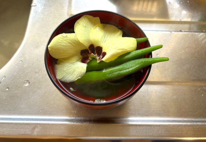 写真、「広島県産オクラのお椀、朝摘みの花弁をのせて」と赤坂の料亭のお品書きにありそうじゃない?、、、行ったことないんで言いたい放題(‘ω’)、、、しかもビジュアル的に問題ありですね、我ながら(>_<)