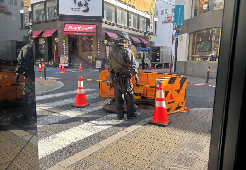 店の真ん前のマンホールの蓋を外して、わたしゃ50年以上ここに居るけど初めて見たマンホールの中、、蓋のすぐ下には「ガス酸欠注意」と書いてあって、何やら装置で大丈夫かどうか確認してから作業員のおにいさん、手際よく中に降りていきました。。