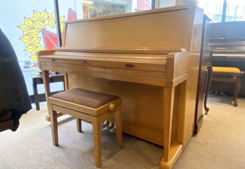色合いは明るめのナチュラルオークで、インテリア的要素も満点。。スライド式鍵盤蓋もユニークです。音色、タッチ感はアメリカンそのもので、明るくかつ幅のある音です。今回弊社で入念に調整してありますので、末永くお使いいただけます。とても雰囲気の良い新品イタリア製ベンチもお付けします。