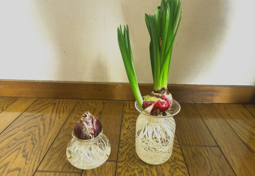 毎年恒例のヒヤシンスの水栽培、、、昨年庭でたくさん掘り起こした球根の中から強そうな?もの二つで始めました(^^)/