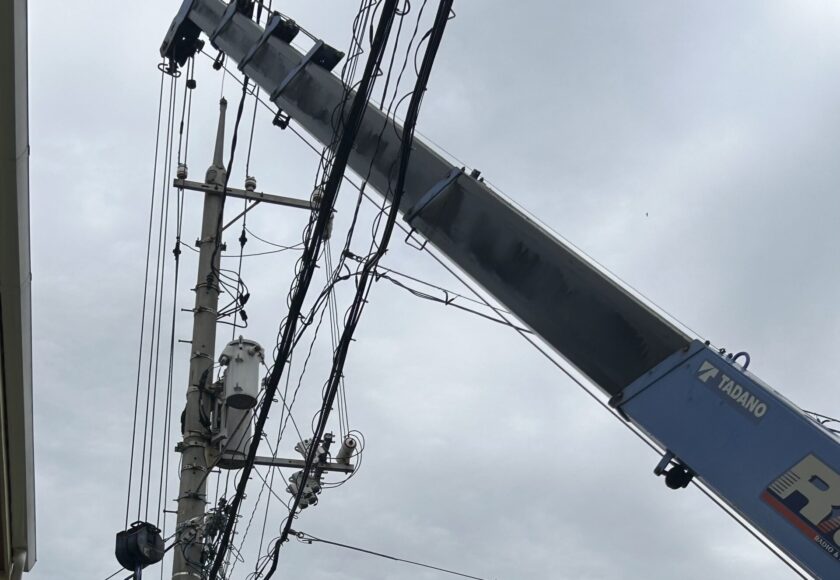 この「技」が結構絶妙でね、、、電線が何本も通っている間にレッカーのアームを延ばして、それでもって限られたスペース(電線と電線の間)を動かしてピアノをベランダに近づけなきゃいけない(>_<)、、、かなり難易度高し。。